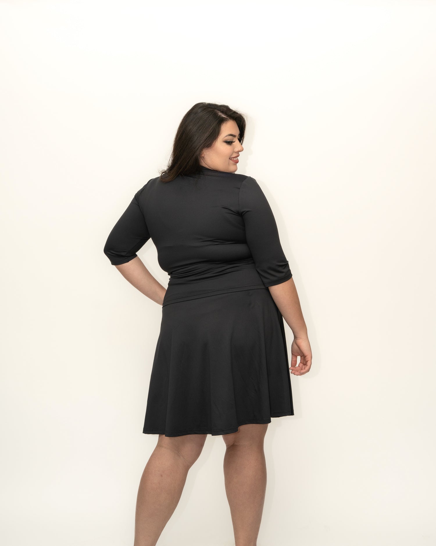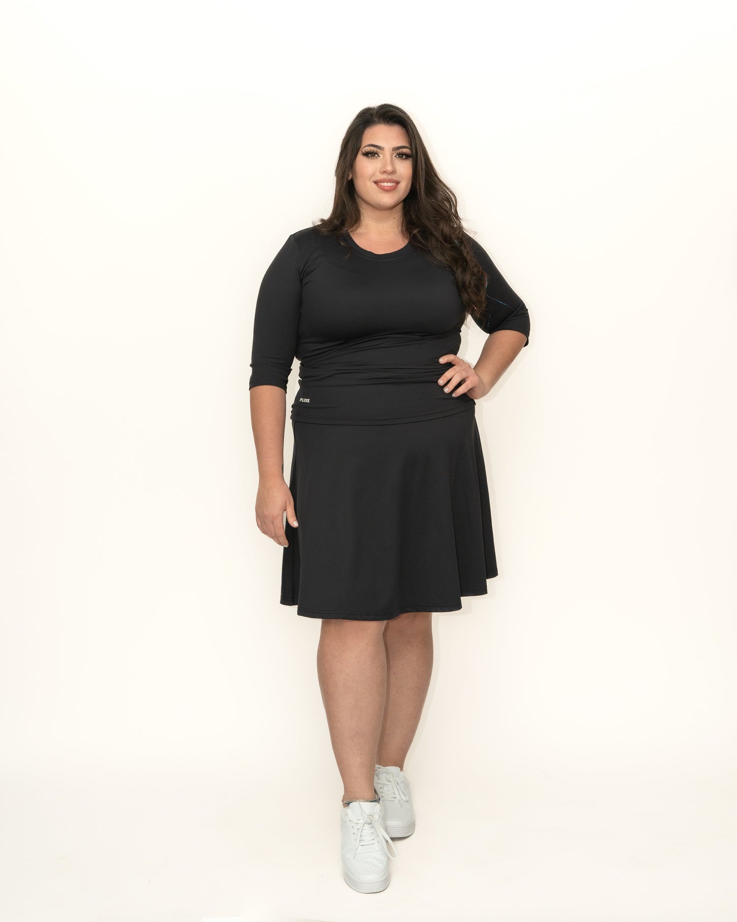 Our knee - length, sporty, high rise skirt is a must have item. Providing the wearer with both comfort and convenience, this soft, sweat wicking skirt includes a zipper pocket on the back to hold your cards, keys, or even your phone.