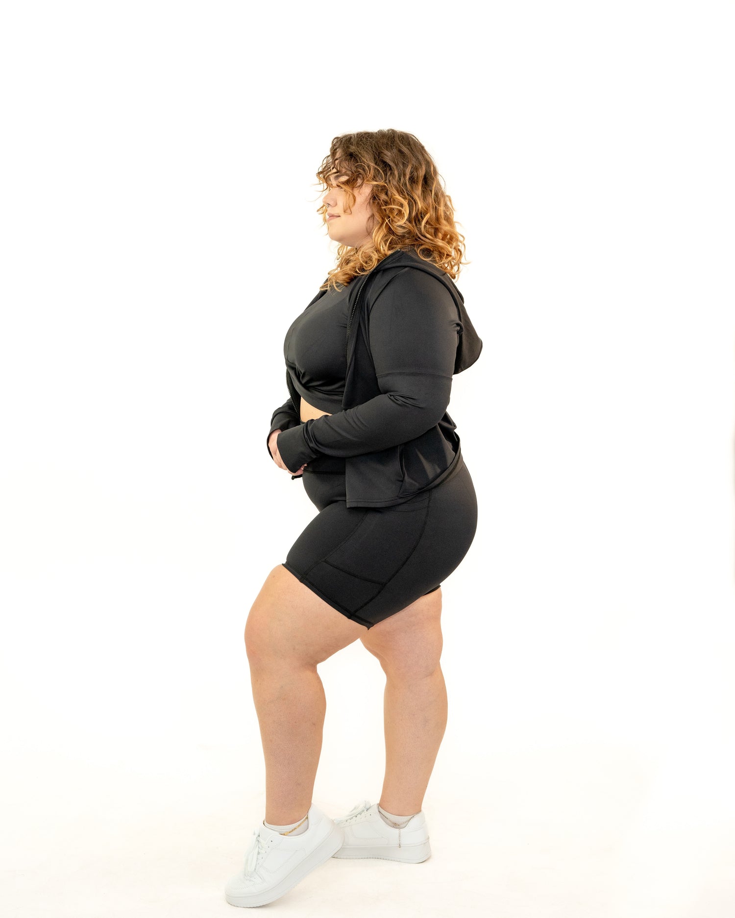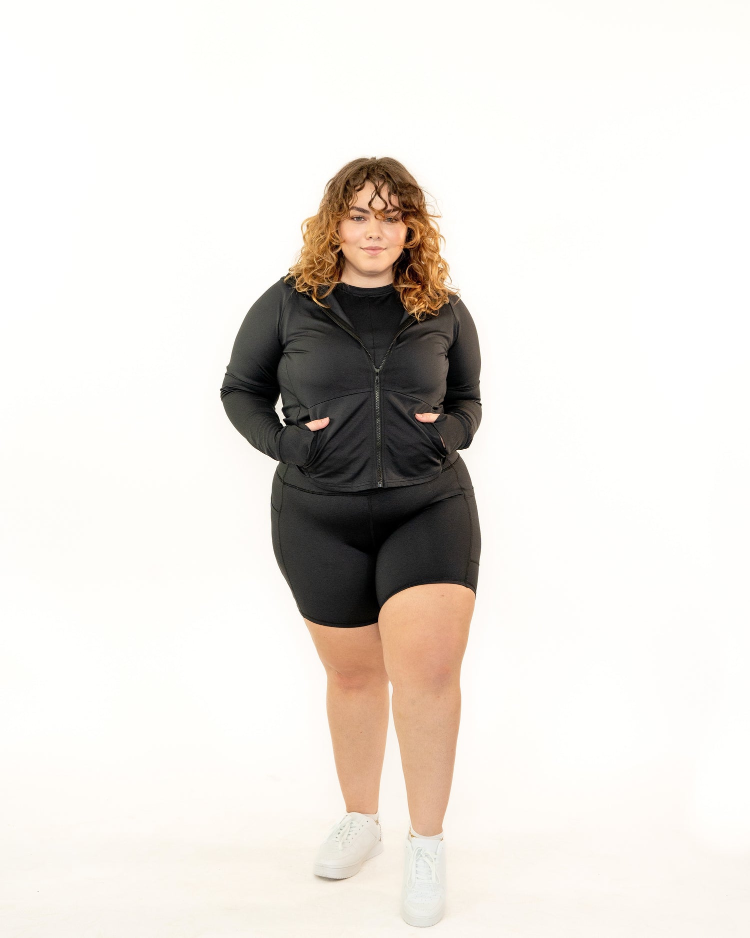 This stylish workout jacket is the perfect layering piece, promising to provide comfort with its soft, sweat wicking fabric, and added convenience with its pockets and hood.