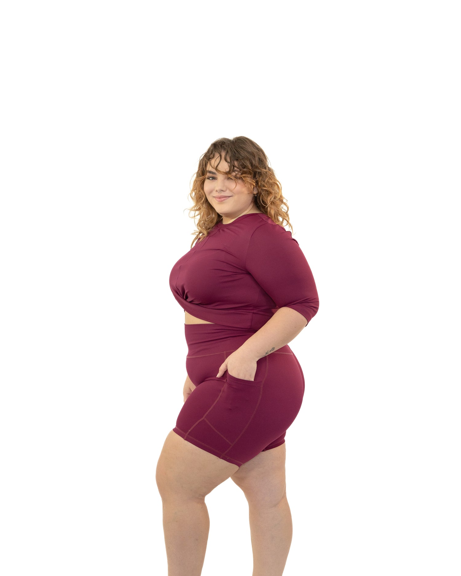A modest take on our sleeveless crop top, this 3/4 sleeve crop top with a twist, is both sporty and fashionable. Comfort is provided with its soft and sweat wicking fabric, promising to keep everything in place. Able to be worn in and out of the gym, this top serves as the perfect transitional statement piece.